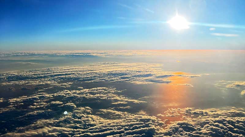 Vista aérea da atmosfera terrestre com o sol iluminando as nuvens, representando a proteção da camada de ozônio.